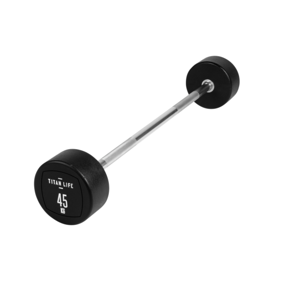TITAN LIFE PRO Barbell 45 kg er en vægtstang med fast vægt, som både kan bruges til at træne biceps og triceps. Vægtenheden er svejset fast til vægtstangen og beklædt med polyurethan. Den er egnet til træningscenteret, foreningsfitness mm. Fordelen med en vægtstang med fast vægt er, at der ikke skal bruges tid på udskiftning af vægtskiver, samt at vægtstørrelser har et spring på 5 kg. fra 10 – 45 kg.