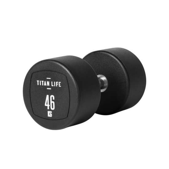 TITAN LIFE PRO Dumbbell 46 kg er en håndvægt lavet i kommerciel kvalitet, som er meget behagelig at holde ved og kan bruges til træning af hele kroppen. Du har mulighed for at vælge mellem vores brede sortiment som går fra 2 kg. til 60 kg. (kun lige tal). Vores håndvægte er svejset sammen med et buet håndtag, som giver et optimalt greb og som er stabile, så de ikke går løs under træning. Disse håndvægte kommer i et unikt design med PU betræk på vægtenheden. Det tykke gummilag sikrer lavt støjniveau, samt beskytter dit gulv.